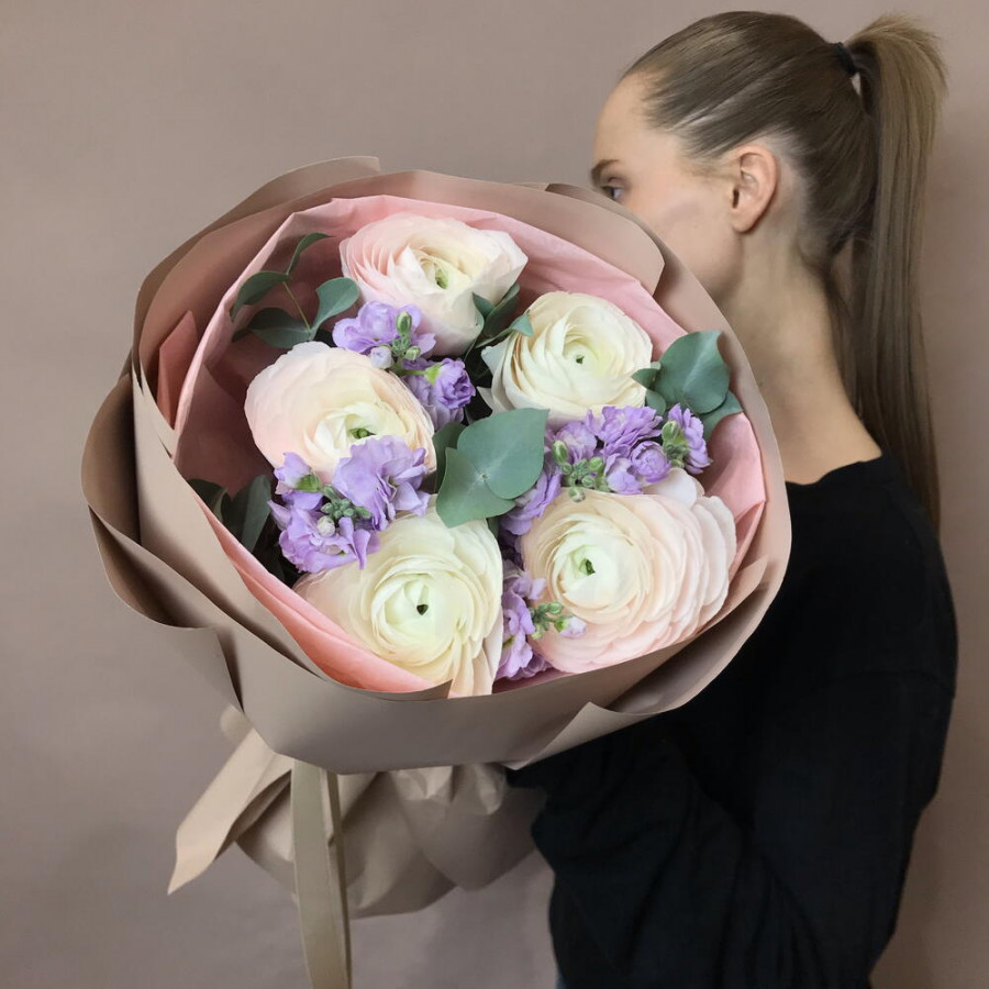 Букет из розовых ранункулюсов и сиреневой матиолы в Кинешме