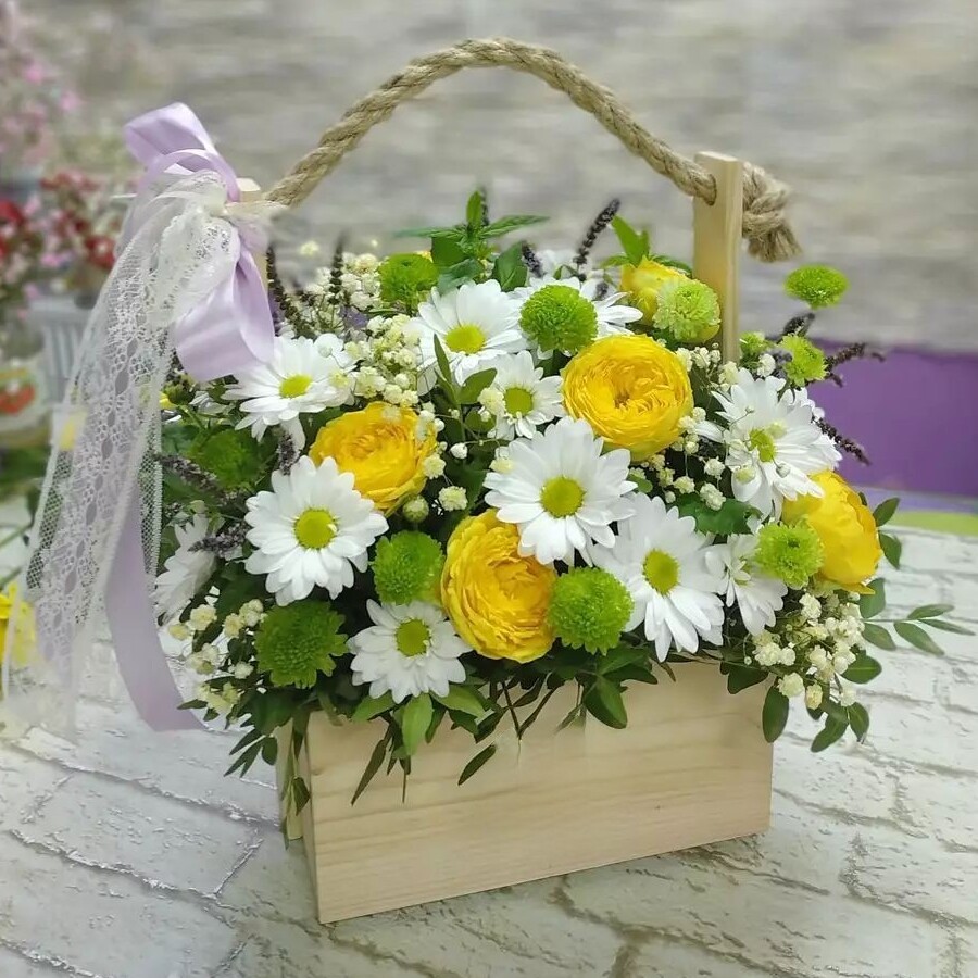 На фото кустовые хризантемы в деревянном ящике. В составе: хризантема кустовая 4 шт, кустовая роза 3 шт, гипсофила 2 шт, писташ 4 шт, деревянный ящик (s) 1 шт, . Все цветы свежие и ароматные, букет красиво оформлен и отлично подходит для подарка. Доступна доставка цветов или самовывоз.