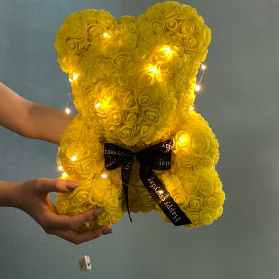 На фото желтый мишка из роз с огоньками. В составе: . Все цветы свежие и ароматные, букет красиво оформлен и отлично подходит для подарка. Доступна доставка цветов или самовывоз.